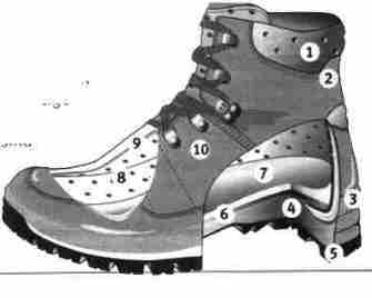 | 1. Ventilationsoeffnung at tongue and shank derives steam. 2. Thread rejects water. 3. High edge of rubber protects against sharp edged stones. 4. Intermediate sole made of PU (PU) is long-lived and absorbs impacts. 5. Special rubber mixture lets sole cling also on slippery soil well. 6. Fire sole made of plastic gives the necessary rigidity to the shoe. 7. Inserting soles are herausnehmbar (for orthopaed. Inserts). 8. Extra-soft interior fodder from leather or Goretex with openings for ventilation. 9. Soft, air-permeable pad foam protects against pressure points. 10. Upper leather is rejecting and very durable water. |