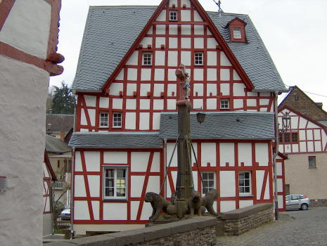 Löwendenkmal mit Fachwerkhaus
